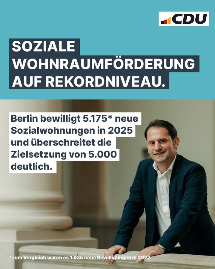 Wir setzen uns Ziele, um sie zu erreichen! Zum zweiten Jahr in Folge übertrifft Berlin die Zielsetzung von 5.000 bei der Bewilligung neuer Sozialwohnungen. Während es im Jahr 2022 lediglich 1.935 Sozialwohnungen waren, wurden im Jahr 2025 insgesamt 5.175 Wohnungen bewilligt. Mit über 1,3 Milliarden Euro entsteht damit neuer Wohnraum. Uns sind breite Einkommensgruppen, Barrierefreiheit und Klimaverträglichkeit besonders wichtig. Wie nehmen die Bedürfnisse der Menschen ernst und setzen auch für 2026 klare Schwerpunkte.#wohnraumförderung #bezahlbarerwohnraum #engagierthttps://www.berlin.de/sen/sbw/presse/pressemeldungen/pressemitteilung.1630189.php
